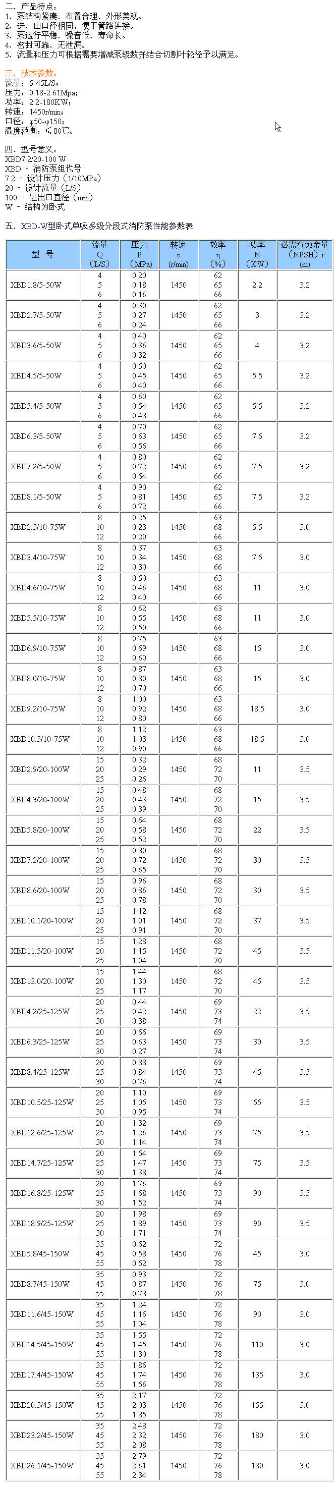 XBD-W型臥式單吸多級分段式消防泵![]() XBD-W型臥式單吸多級分段式消防泵 更多信息一、產品概述: XBD-W型臥式單吸多級分段式消防泵,是最新開發生產的節能系列產品。具有效率高、運行噪音低、抗汽蝕性能好、結構合理、使用壽命長等顯著優點。供輸送不含固體顆粒的清水及物理化學性質類似于水的液體之用,主要用于消防系統增壓送水、也可應用于廠礦給排水、高層建筑增壓送水、遠距離送水、采暖、浴室、鍋爐冷暖水循環增壓、空調制冷系統送水及設備配套等場合。 本司生產的XBD-W型系列消防泵其性能、技術條件符合國家新頒布的GB6245-1998《消防泵性能要求和試驗方法》標準的要求,產品經國家消防裝備質量監督檢測中心測試合格,獲上海市消防產品認可證書。 |