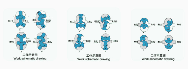 一、產(chǎn)品概述: 轉(zhuǎn)子泵又稱膠體泵,三葉泵,鞋底泵等。依靠兩同步反向轉(zhuǎn)動的轉(zhuǎn)子(齒數(shù)為2-4)在旋轉(zhuǎn)過程中于進(jìn)口處產(chǎn)生吸力(真空度),從而吸入所要輸送的物料。兩轉(zhuǎn)子將轉(zhuǎn)子室分隔成幾個(gè)小空間,并按a→b→c→d的次序運(yùn)轉(zhuǎn)。運(yùn)轉(zhuǎn)至位置a時(shí),只有I室中充滿介質(zhì); 到位置b時(shí),B室中封閉了部分介質(zhì); 到位置c時(shí),A室中也封閉了介質(zhì); 到位置d時(shí),A、B室與Ⅱ室相通,介質(zhì)即被輸送至出料口。如此循環(huán)往復(fù),介質(zhì)(物料)即被源源不斷地輸送出。