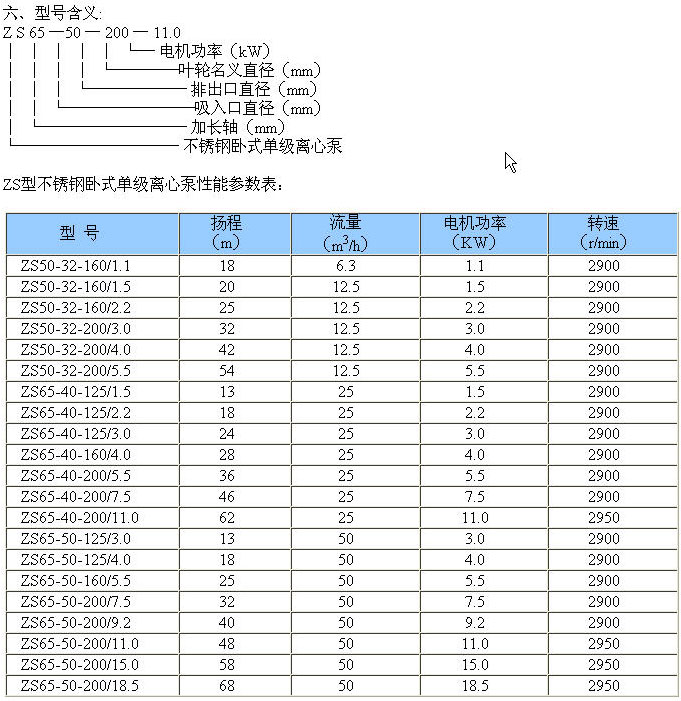 ZS型不銹鋼臥式單級離心泵性能參數表: