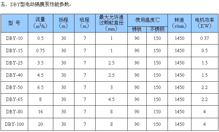 DBY型電動隔膜泵一、產(chǎn)品概述: DBY系列電動隔膜泵是一種 的泵類,近年來,由于在隔膜材質(zhì)上取得了突破性的進展,國際上越來越多的工業(yè)化國家采用此種型式的泵,取代部份離心泵、螺桿泵,來應(yīng)用于石化、陶瓷、冶金等行業(yè),產(chǎn)品設(shè)計均參考美國ABEL公司樣機,該泵適用于低壓,即出口壓力≤3kgf/cm2的場合。 二、主要用途: 1、各種劇毒、易燃、易揮發(fā)液體。 2、各種強酸、強堿、強腐蝕液體。 3、可輸送較高溫度的介質(zhì) 4、作為各種壓濾機前級送壓裝置。. 5、熱水回收及循環(huán)。 6、油罐車、油庫、油品裝卸。 7、泵吸泡菜果醬、土豆泥、巧克力等。 8、泵吸油漆、樹膠、顏料粘合劑。 9、各種瓷器釉漿水泥灌漿灰漿泥漿。 10、各種橡膠漿乳膠、有機溶劑、填料。 11、用泵為油輪駁船清倉吸取倉內(nèi)污水及剩油。 12、啤酒花及發(fā)酵粉稀漿、糖漿、糖蜜。 13、泵吸礦井、坑道、隧道、下水道中污水、沉淀物。 14、各種特殊介質(zhì)的吸送。 三、技術(shù)參數(shù): 流量:0 揚程: 功率:0.37-4kw; 轉(zhuǎn)速:1450r/min; 口徑:10 溫度:-15-+ 自吸高度:5 四、型號意義: DBY – 40 DBY - 電動隔膜泵; 40 - 進出口直徑(mm)