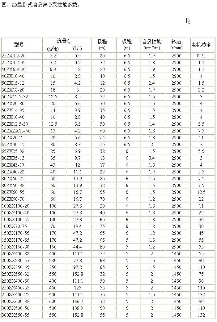 一、產品概述: ZX系列型泵是臥式自吸離心泵。該型式泵與其它型式的自吸離心泵比較,因為泵本身沒 有逆止閥,結構最為簡單;工作最為可靠;無 故障工作時間長,維護、使用方便、體積小、 重量輕、效率高、在設計上做了特別的考慮與相同口徑的泵比較,排量大、性能高。
