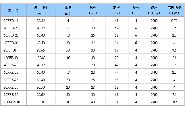 一、產(chǎn)品概述: FPZ耐腐蝕自吸離心泵,采用聚偏氟乙烯(PVDF)、增強(qiáng)聚丙烯(RPP)一次注塑成型。機(jī)械強(qiáng)度高,耐腐蝕性能強(qiáng),結(jié)構(gòu)上有獨(dú)具一格的科學(xué)性,泵腔內(nèi)設(shè)有吸液室、儲液室、回液止回室、氣液分離室、回流孔。只需在第一次開機(jī)前灌注引液,以后不必重復(fù)灌注引液,吸入管安裝液下閥,工作時機(jī)械密封不需另加冷卻水冷卻,操作簡便、安全無泄漏,是取代液下泵的 產(chǎn)品,適用于 三、FPZ耐腐蝕自吸離心泵性能參數(shù)表: