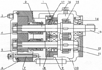 1、雙列球軸承 2、泵用機(jī)械密封 3、O形密封圈 4、泵面蓋 5、三葉形泵輪 6、泵體 7、雙頭螺柱 8、軸承壓蓋 9、軸承支座 10、齒輪輪箱 11、圓錐滾子軸承 12、傳動(dòng)軸 13、主傳動(dòng)軸 14、齒輪箱后蓋 15、斜齒輪輪(一對(duì)) 16、油封 17、O形密封圈