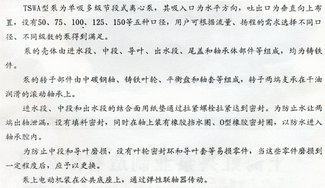 導(dǎo)航:回首頁---當(dāng)前位置---水泵產(chǎn)品內(nèi)容頁補(bǔ)充頁 >> TSWA型臥式多級(jí)離心泵結(jié)構(gòu)的說明 |